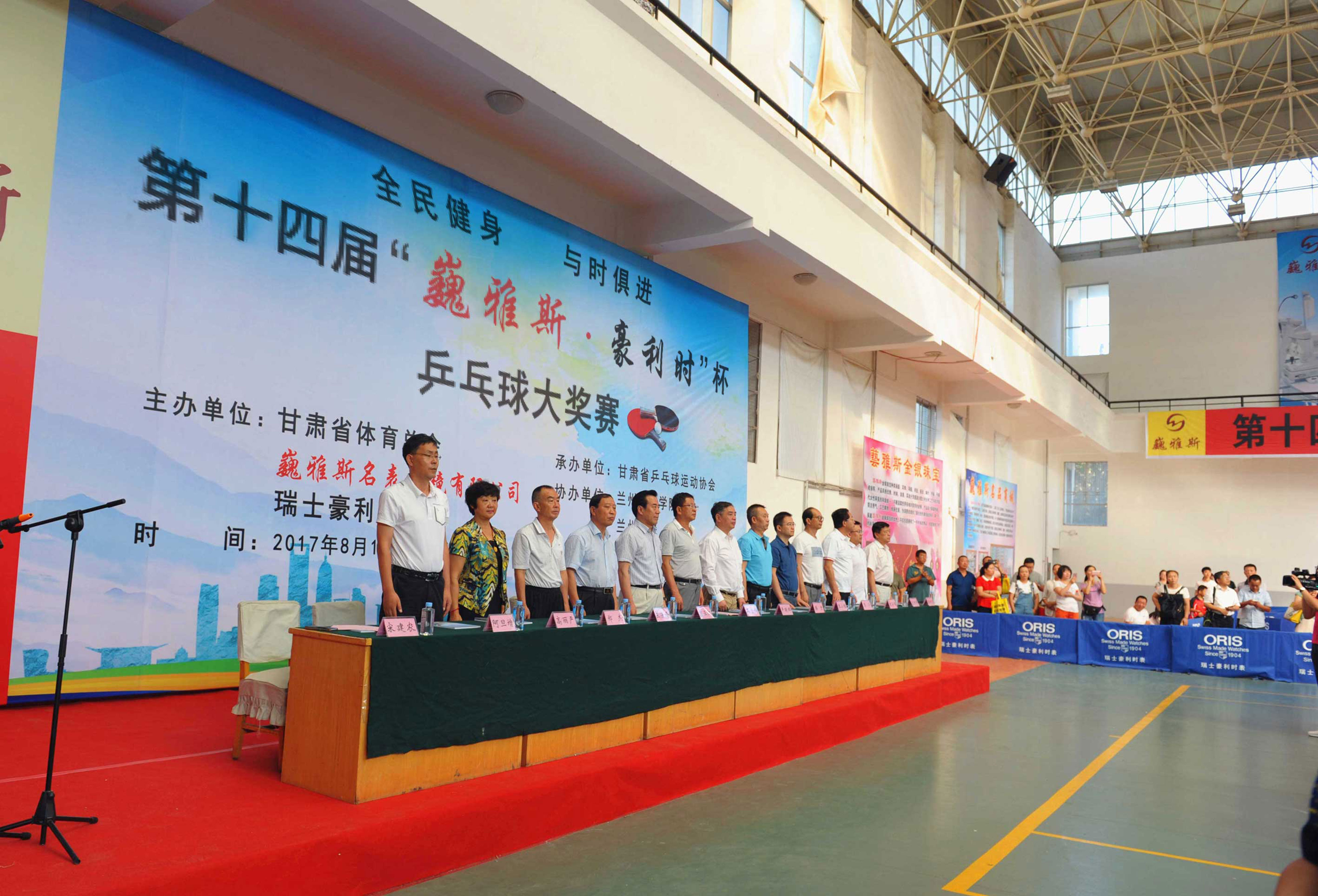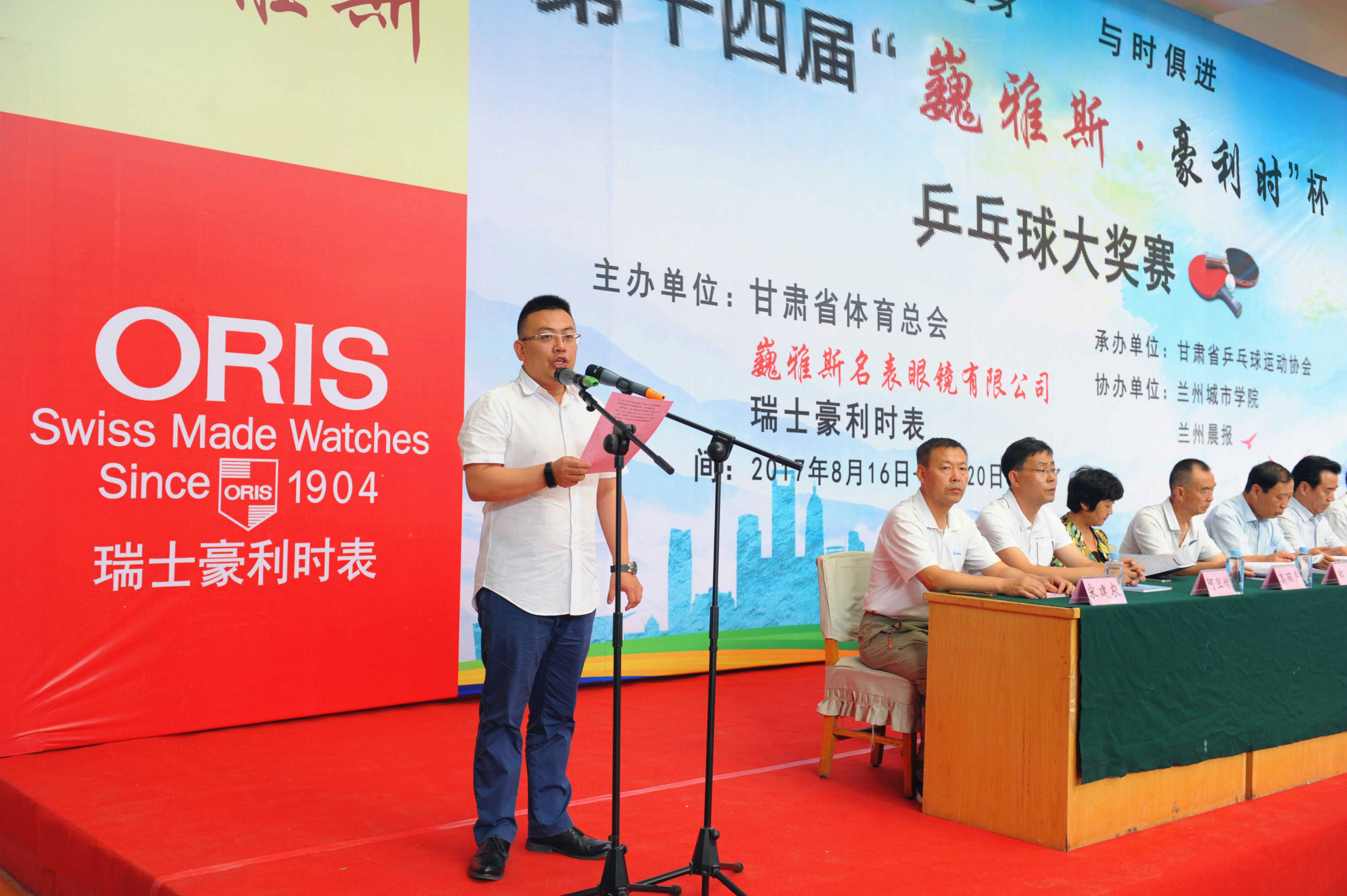 中國(guó)商業(yè)聯(lián)合會(huì)鐘表商分會(huì)副會(huì)長(zhǎng)、甘肅省眼鏡協(xié)會(huì)會(huì)長(zhǎng)、甘肅省乒乓球協(xié)會(huì)副會(huì)長(zhǎng)、巍雅斯名表眼鏡有限公司董事長(zhǎng)裴正江,瑞士豪利時(shí)表中國(guó)區(qū)總經(jīng)理嚴(yán)明輝先生及有關(guān)領(lǐng)導(dǎo)、運(yùn)動(dòng)員、裁判員、教練員、工作人員一千兩百多人參加了簡(jiǎn)樸但氣氛熱烈的大獎(jiǎng)賽開幕式。