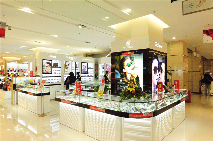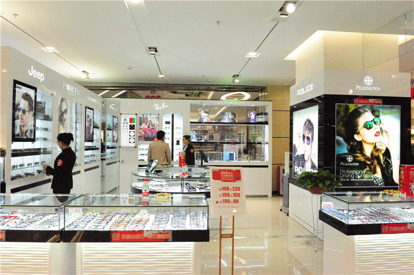 眼鏡區(qū)域位于萬達百貨二樓扶梯旁,配備有先進的進口驗光設(shè)備,能夠為顧客提供專業(yè)、細致的驗光服務(wù),并陳列有各種花色的太陽鏡和鏡架供顧客選擇。