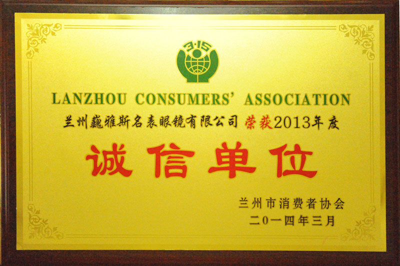 3?15國際消費者權益日前夕,蘭州巍雅斯名表眼鏡有限公司被蘭州市消費者協(xié)會評為2013年度“誠信單位”,連續(xù)10年獲得“誠信單位”的稱號。